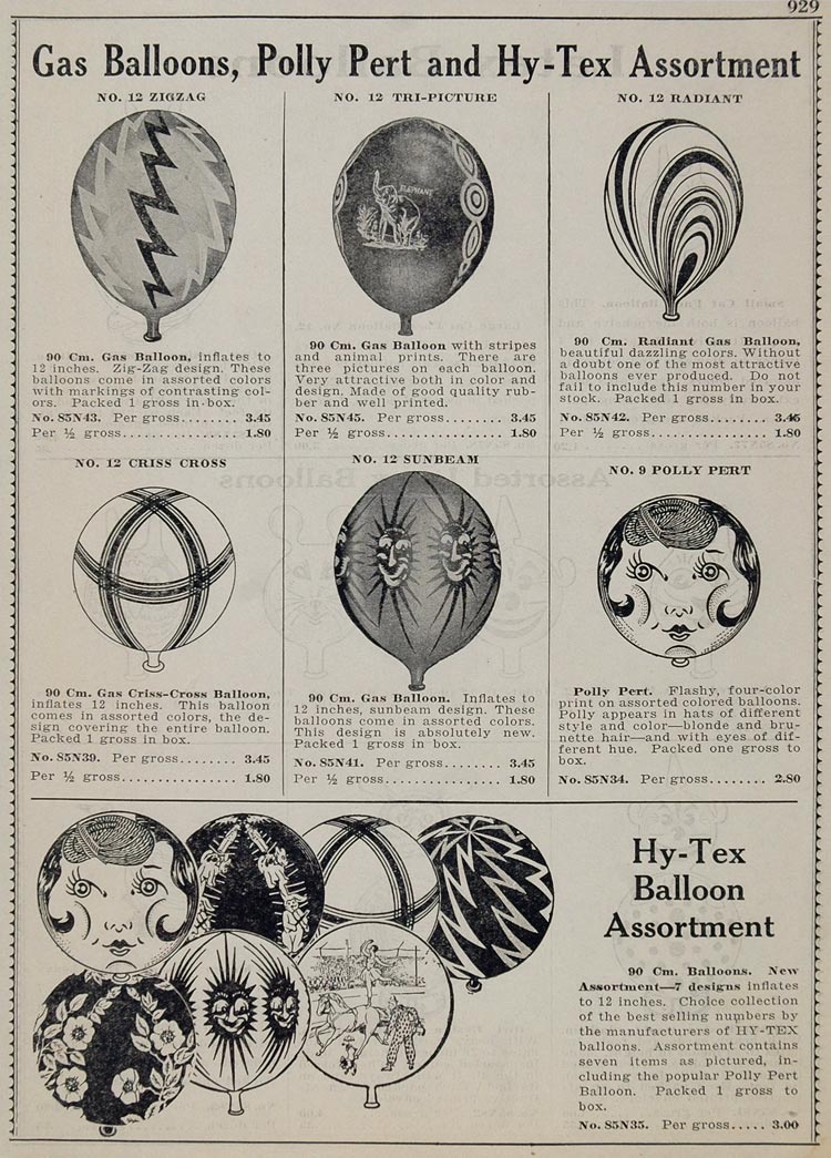 This is an original 1934 black and white print ad for a variety of of Gas Balloons, for parties, banquets, dances, etc., including the Polly Pert Balloon and the Hy-Tex Balloon Assortment.