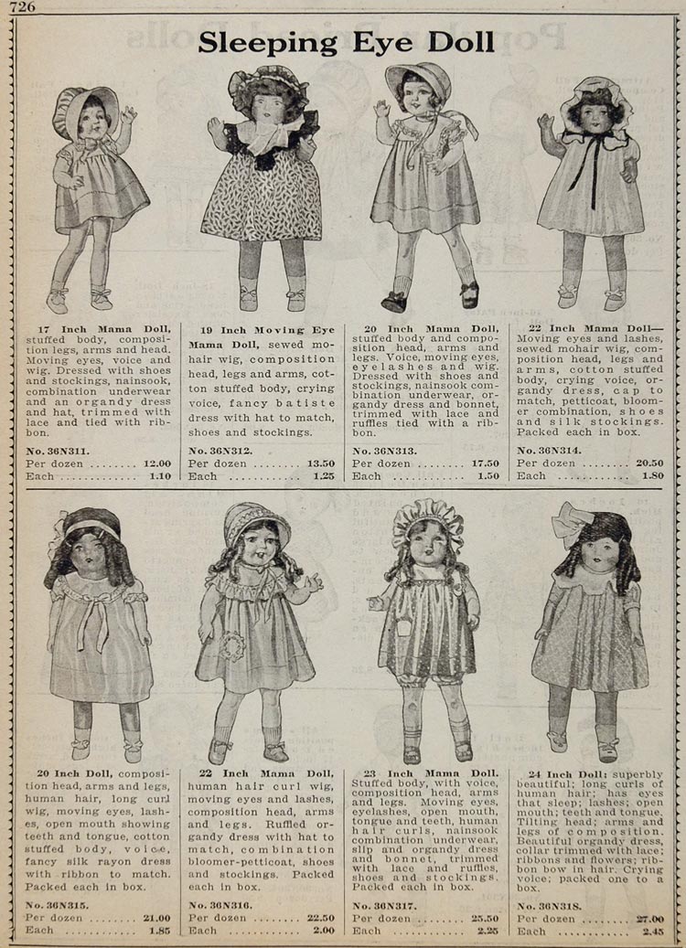 This is an original 1934 black and white print ad for a variety of Sleeping Eye Mama Dolls.