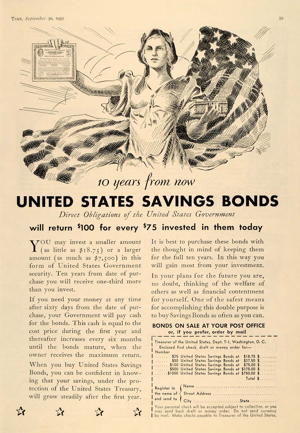 This is an original 1935 black and white print ad for the Treasurer of the United States, located at Dept. T-1 in Washington, D. C. This ad features United States Savings Bonds that will grow in worth over time.