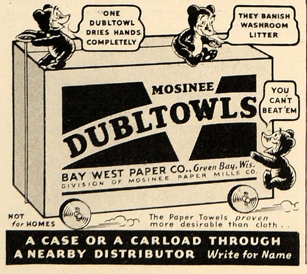 This is a small original 1935 black and white print ad for the Mosinne Dubltowls from Bay West Paper Company located in Green Bay, Wisconsin.