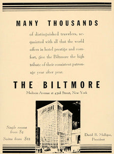 This is an original 1935 black and white print ad for the Biltmore Hotel located on Madison Avenue at 43rd Street, New York.