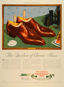 This is an original 1935 Great Depression Era color print ad for Brown Shoes. This ad claims its shoes are friendly, comfortable and stylish. The ad also lists a couple of its featured shoes styles. It also mentions its new free booklet titled, "A Walking Encyclopedia."
