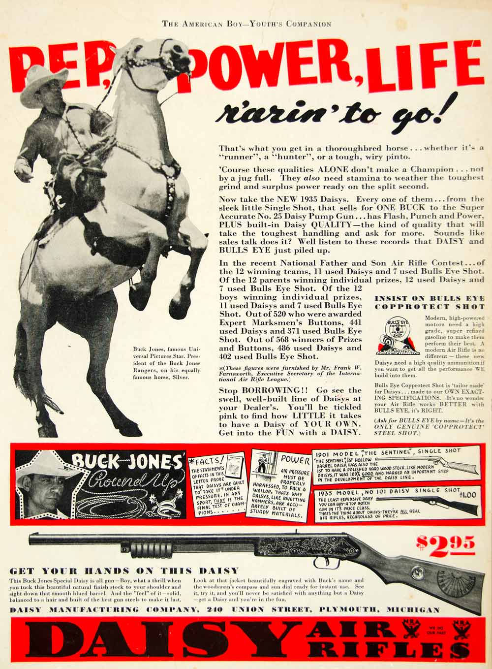 Keywords specific to this image: Vintage Advertising, Firearm, BB, Cowboy, Horse, Equestrian, Wild West, Western, Film, Actor, Celebrity, Movie Star, Universal Picture Studios, No. 25, Pep Power Life, Single Shot, Bulls Eye, Marksmen, Target Shooting, Steel Shot, Copprotect, Ammo, Ammunition, Rangers, Silver, Round Up, Lasso, Spurs, 1901 Model, Sentinel, Hardwood Stock, Engraving, Compass Inlay, Sun Dial Brand, 1935 Model, Michigan, Street, Red, NRA, Boys, Childrens