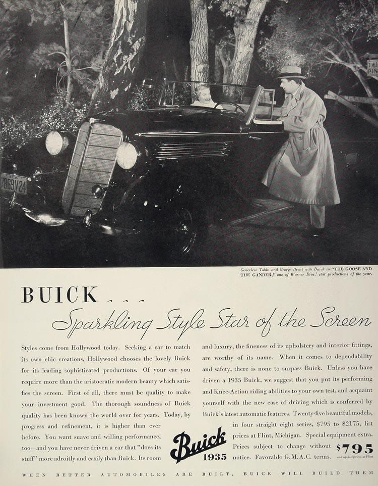 This is an original 1935 black and white print ad for the 1935 Buick automobile. The ad features Genevieve Tobin and George Brent, the stars of the Warner Brothers' movie "The Goose and the The Gander," with a Buick.
