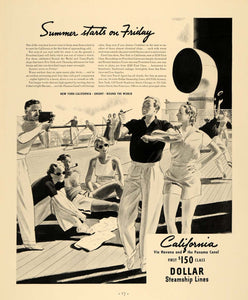 This is an original 1935 black and white print ad for cruise vacations by Dollar Steamship Lines located at 604 Fifth Avenue, New York City, New York; 110 South Dearborn Street, Chicago or 311 California Street, San Francisco.