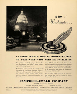 This is an original 1935 black and white print ad for the Campbell-Ewald Company, whose president is Henry T. Ewald, located in the General Motors Building in Detroit, Michigan. This company also has locations in New York, Washington, Chicago, Los Angeles, San Francisco, Portland, Toronto, and Montreal. This ad features an image of Washington, D. C. "Advertising Well Directed."