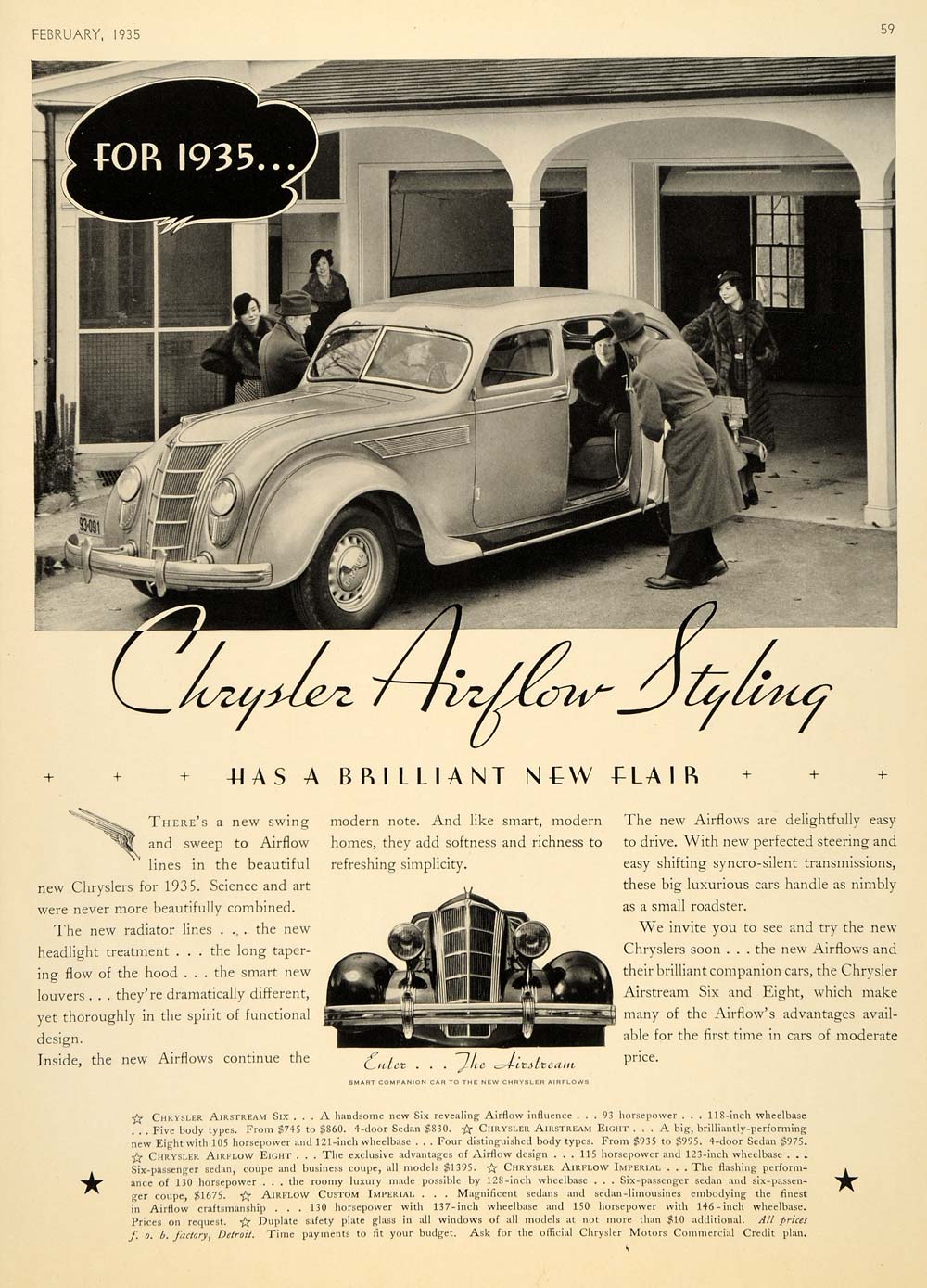 This is an original 1935 black and white print ad for Chrysler Corporation, maker of the new 1935 Chrysler Airstreams, located in Detroit, Michigan.