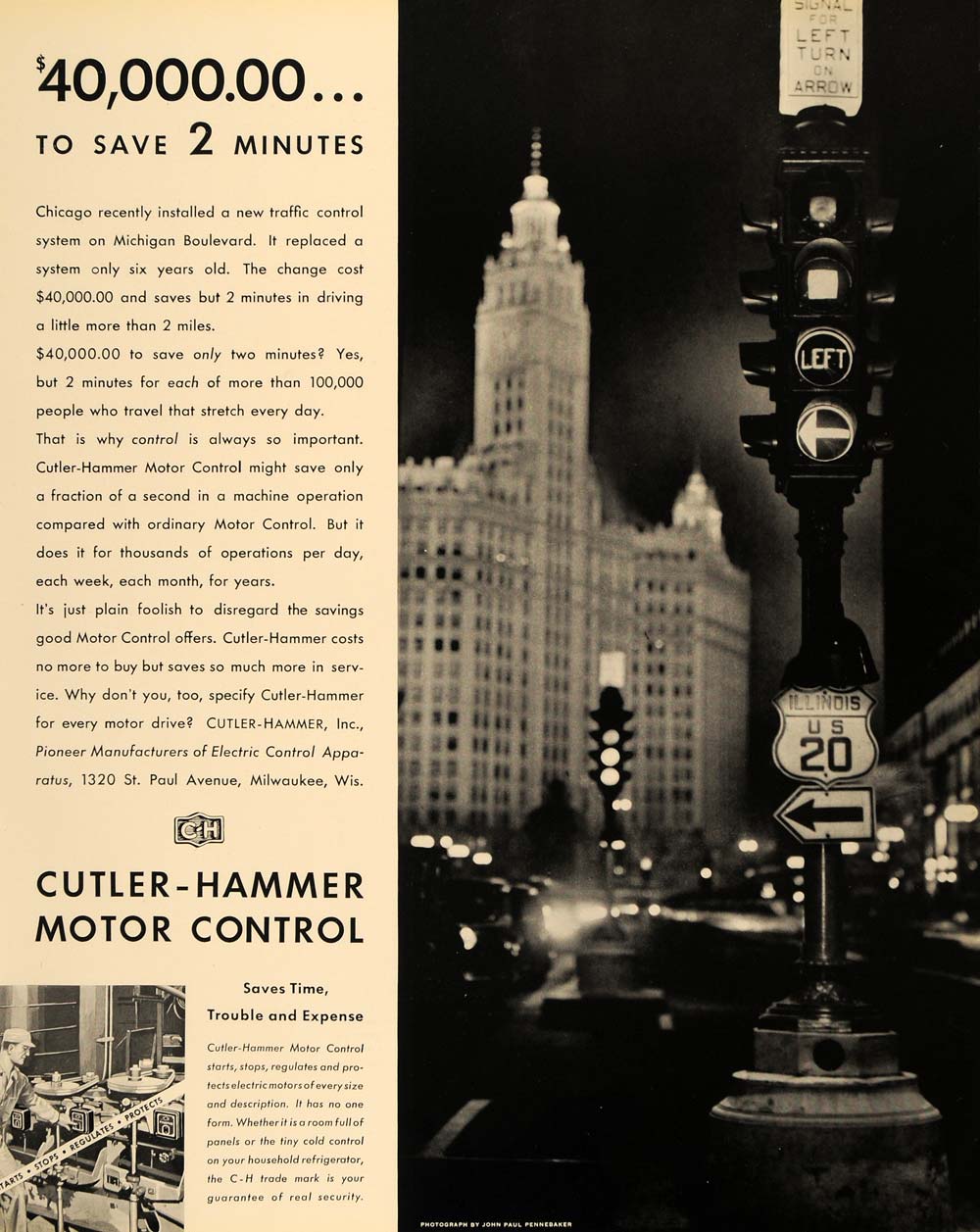 This is an original 1935 black and white print ad for Cutler-Hammer Motor Control, Incorporated, the pioneer manufacturers of Electric Control Apparatus, located at 1320 St. Paul Avenue in Milwaukee, Wisconsin. This ad features a photograph by John Paul Pennebaker.