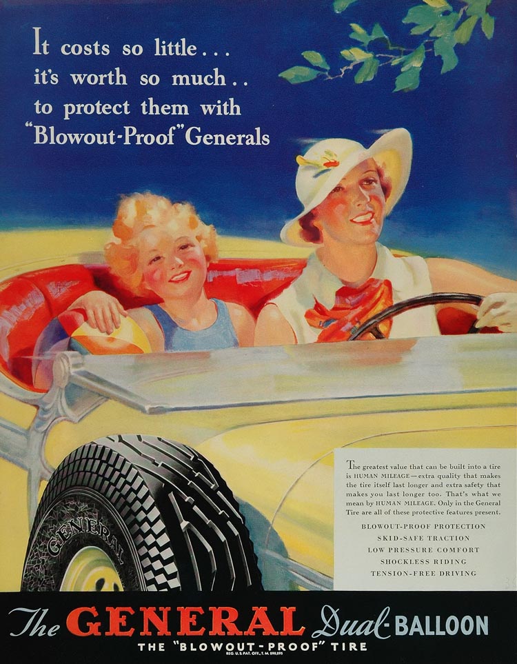 This is a very nice original 1935 print ad, in brilliant color, for the Firestone General Dual Balloon Tire.