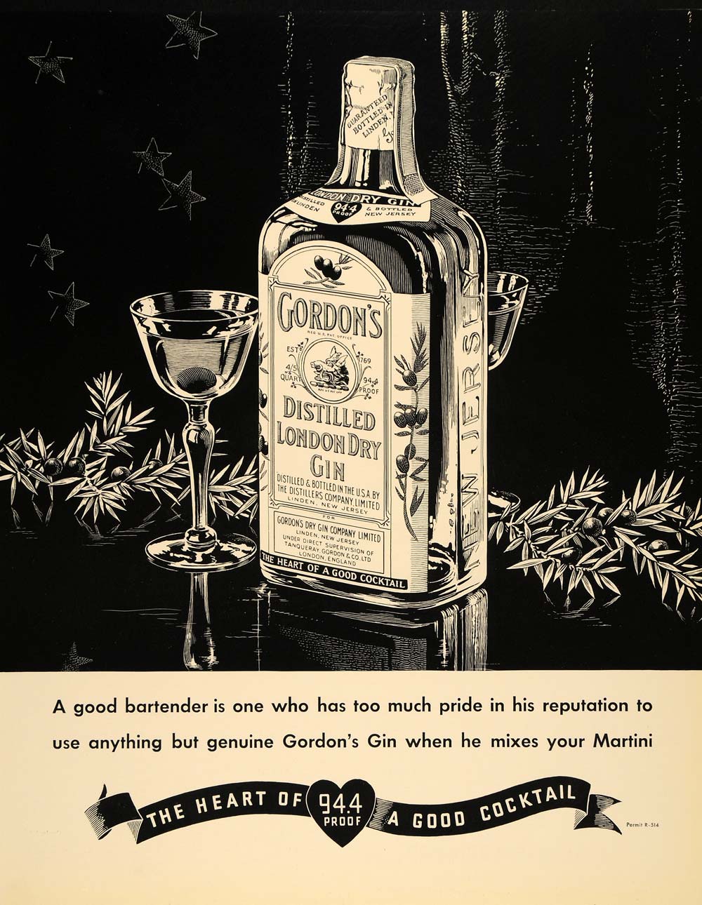 This is a stunning woodcut style original 1935 black and white print ad promoting the Gordon's Distilled London Dry Gin liqueur.