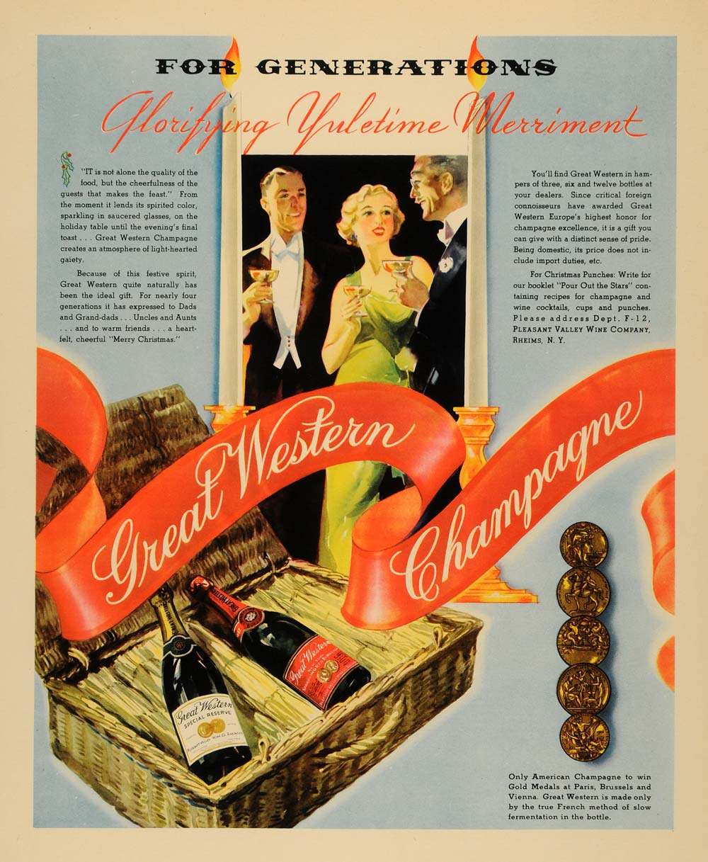 This is an original 1935 color print ad promoting the Great Western Champagne.