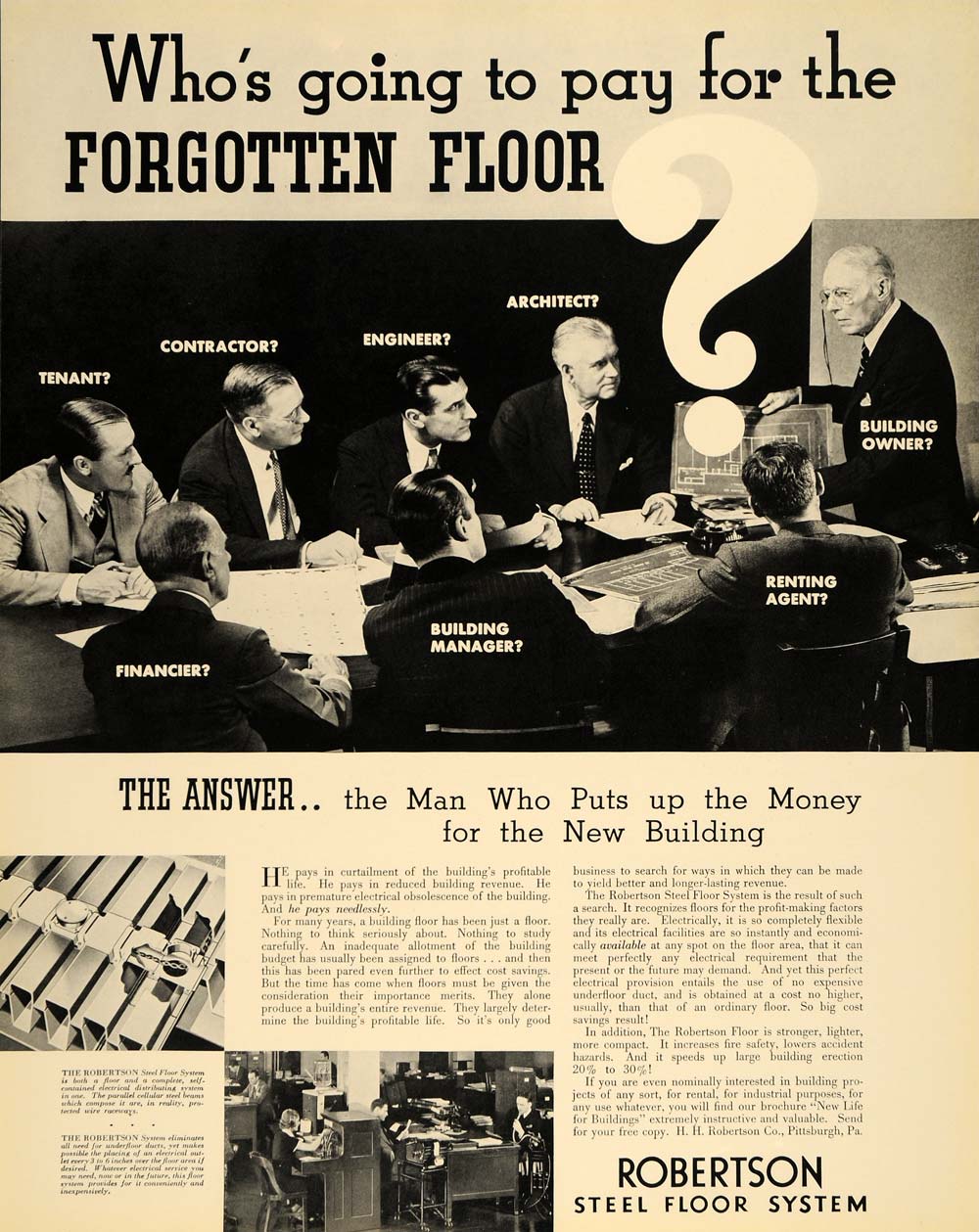 This is an original 1935 black and white print ad for the Robertson Steel Floor System by H. H. Robertson Company located in Pittsburgh, Pennsylvania.