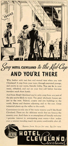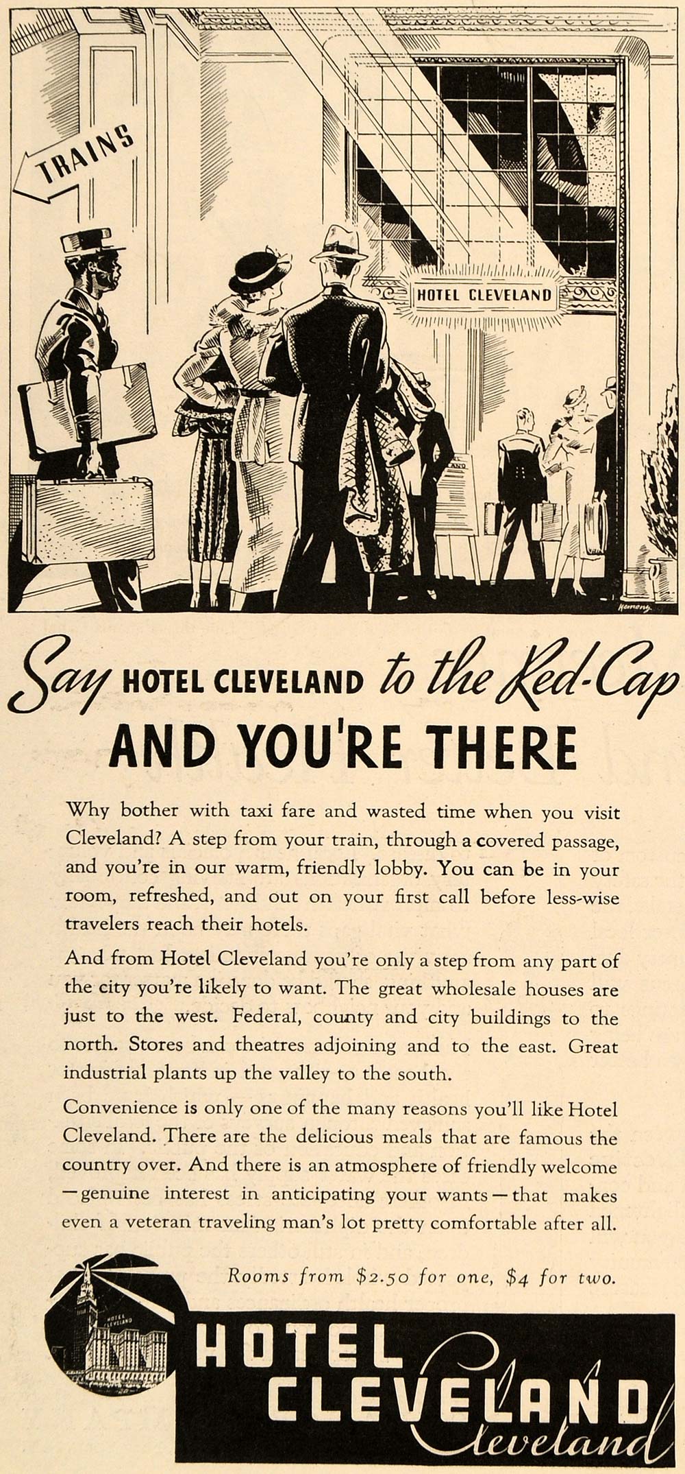 This is an original 1935 black and white print ad for the Hotel Cleveland in Cleveland, Ohio. This ad features their low rates and excellent lodgings for travelers.