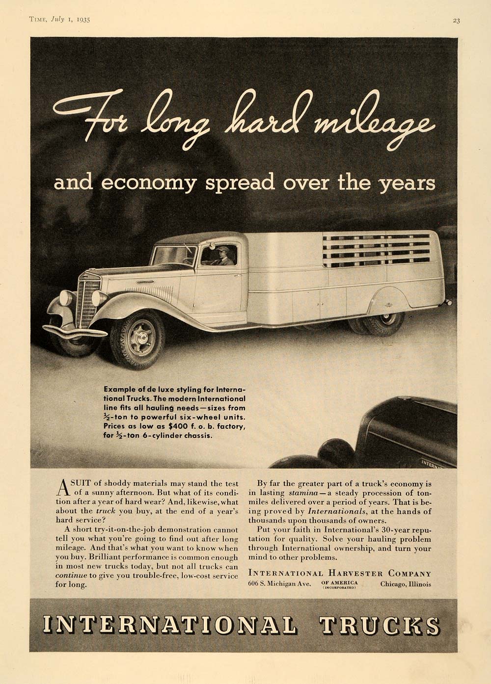This is an original 1935 black and white print ad for the International Harvester Company, located at 606 S. Michigan Avenue in Chicago, Illinois. This ad features their International Trucks for hauling and shipping.