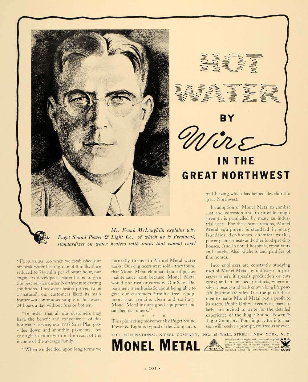 This is an original 1935 black and white print ad for the International Nickel Company, Incorporated, located at 67 Wall Street in New York City, New York, the makers of Monel Metal. This ad features Mr. Frank McLaughlin, the president of Puget Sound Power & Light Company. The portrait of Mr. McLaughlin is done by the artist Georges Schreiber.
