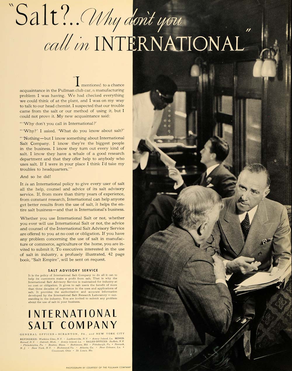 This is an original 1935 black and white print ad for the International Salt Company, featuring a fantastic image of businessmen on a Pullman club car.
