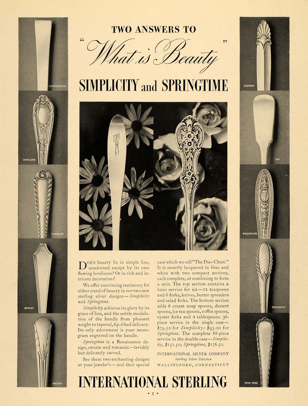 This is an original 1935 black and white print ad promoting the International sterling silverware from International Silver Company located in Wallingford, Connecticut.