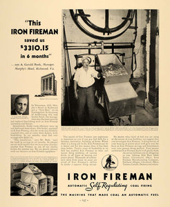 This is an original 1935 black and white print ad for the Iron Fireman Manufacturing Company, Automatic Self Regulating Coal Firing, located in Portland, Oregon.