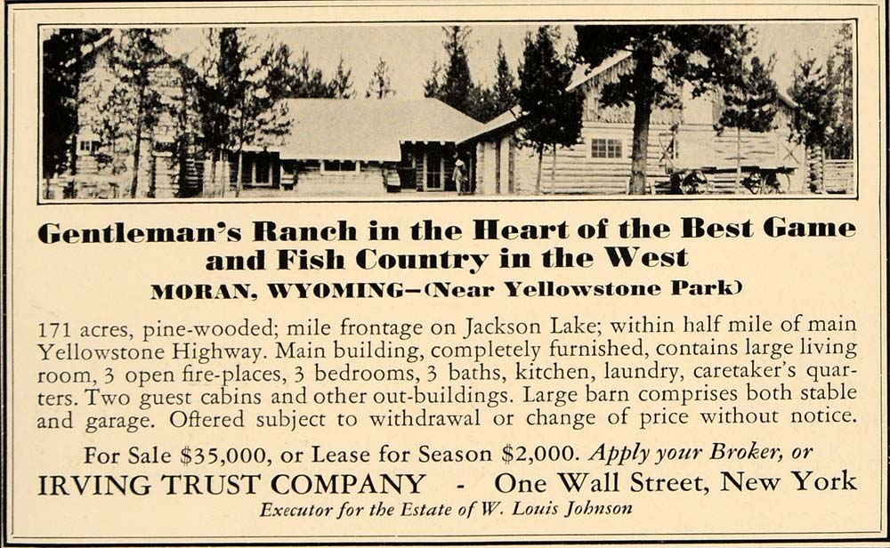 This is an original 1935 black and white print ad for a gentleman's ranch in the West Moran, Wyoming, near the Yellowstone Park, 171 acres, pine-wooded; mile frontage on Jackson Lake; within half mile of main Yellowstone highway from Irving Trust Company located on One Wall Street, New York.