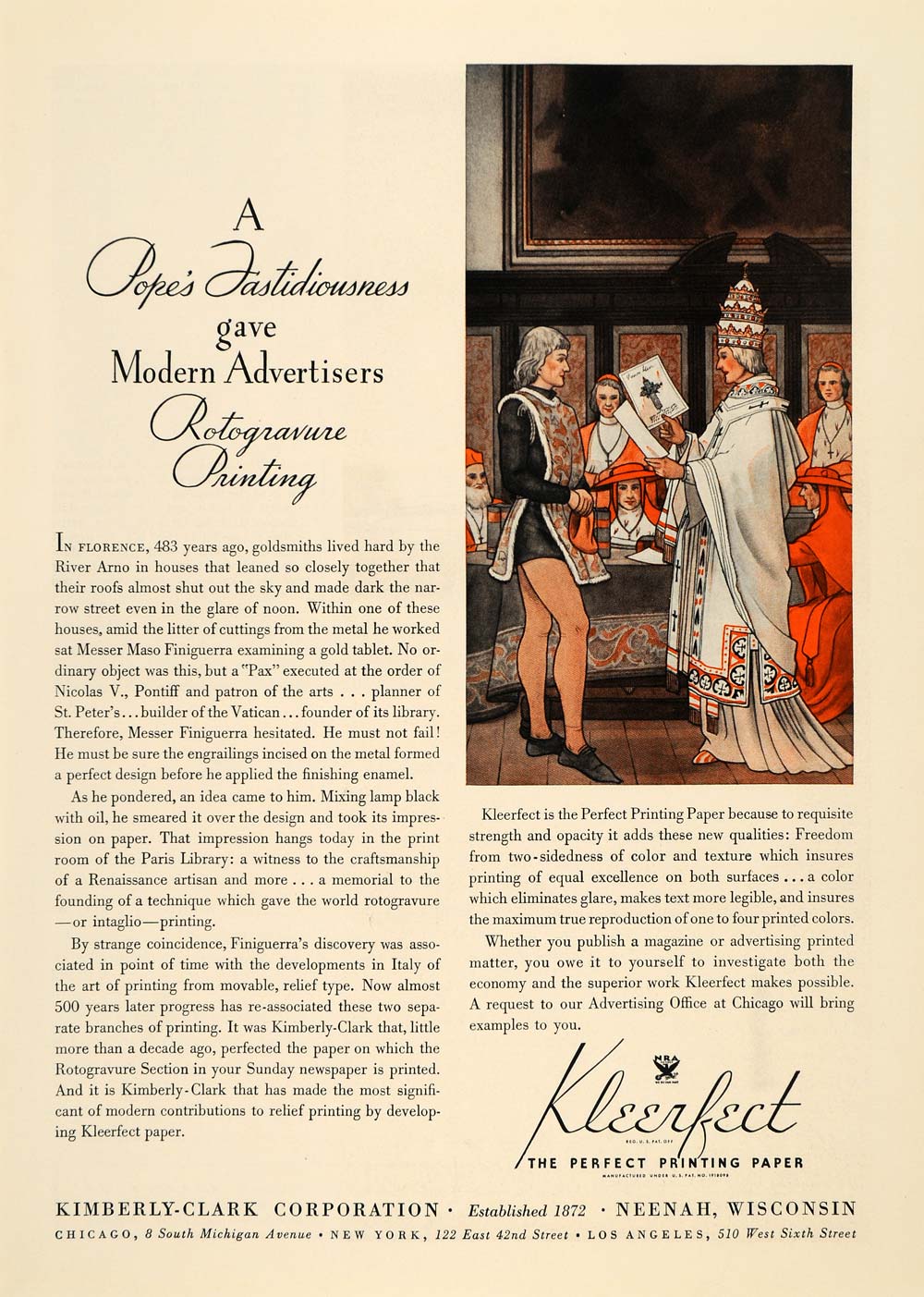 This is an original 1935 color print ad promoting the Kleerfect Printing Paper from Kimberly Clark Corporation located in Neenah, Wisconsin.