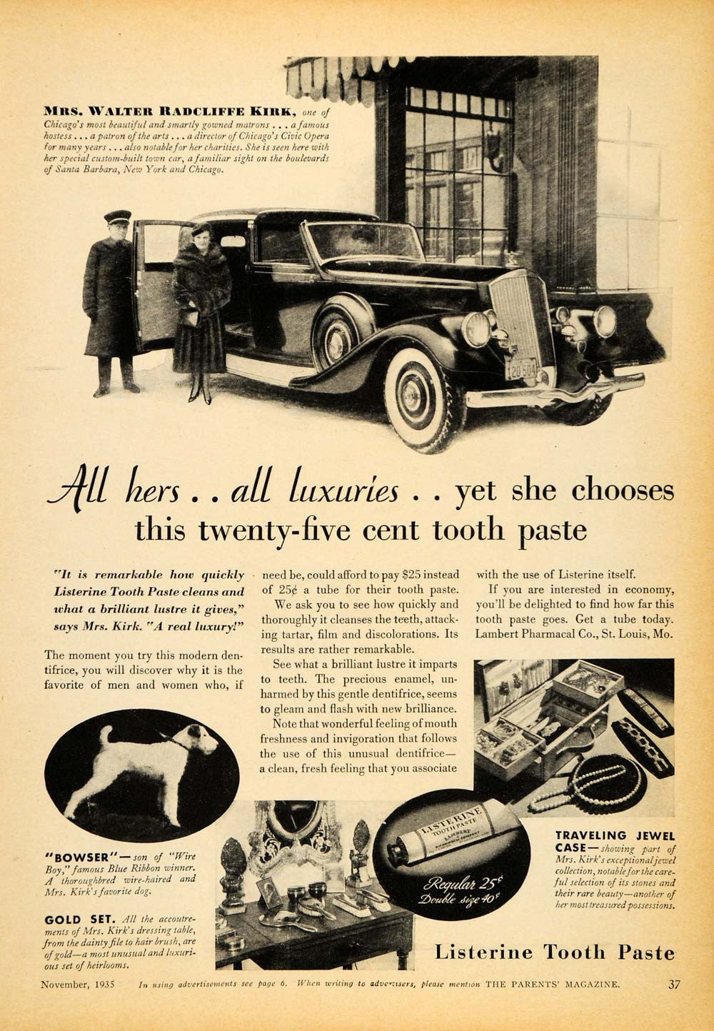This is an original 1935 black and white print ad for Listerine Toothpaste from the Lambert Pharmacal Co. with an endorsement from Mrs. Walter Radcliffe Kirk of Chicago.