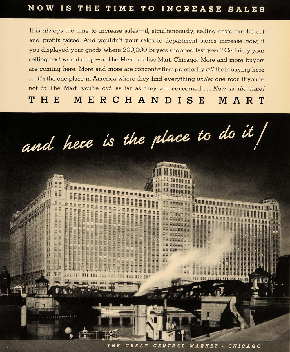 This is a rare original 1935 black and white print ad for the Great Central Market, The Merchandise Mart located in Chicago, Illinois. This is a great image of this building and you can see how majestic it is.