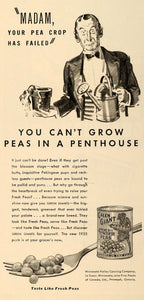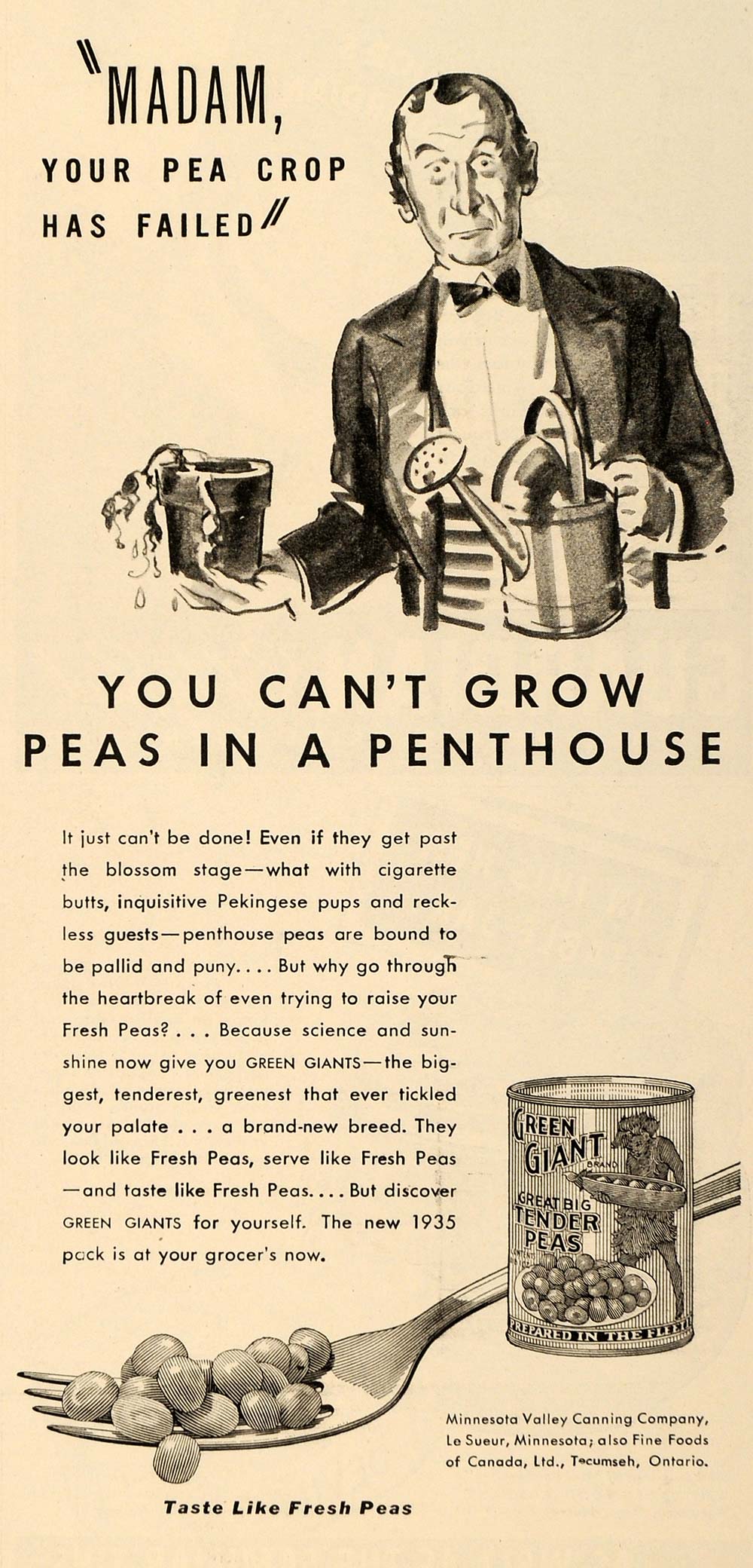 This is an original 1935 black and white print ad for the Minnesota Valley Canning Company of Le Sueur, Minnesota, and Fine Foods of Canada, Ltd., of Ontario. This ad features their Green Giant Tender Canned Peas.