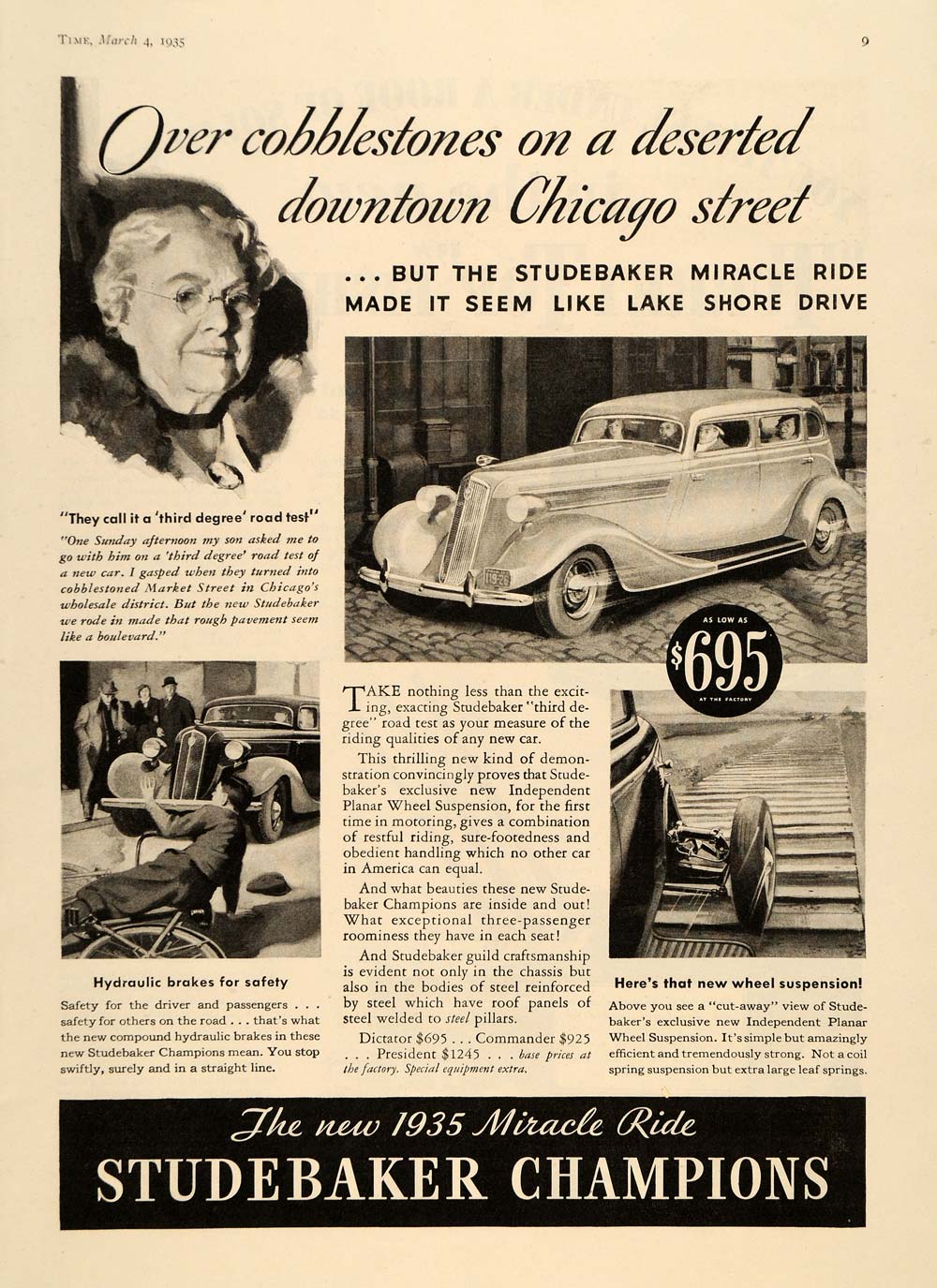 Keywords specific to this image: Vintage Advertising, Pricing, Studebaker Dictator, Studebaker Commander, Studebaker President, Vintage Cars, Vintage Luxury Cars, Hydraulic Brakes, Safety Features, Market Street Chicago, Independent Planar Wheel Suspension, Specifications, Features