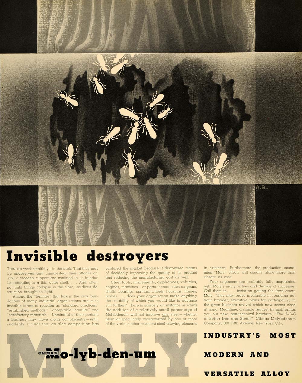 This is an original 1935 black and white print ad for iron and steel by the Climax Molybdenum Company located at 500 Fifth Avenue, New York City.