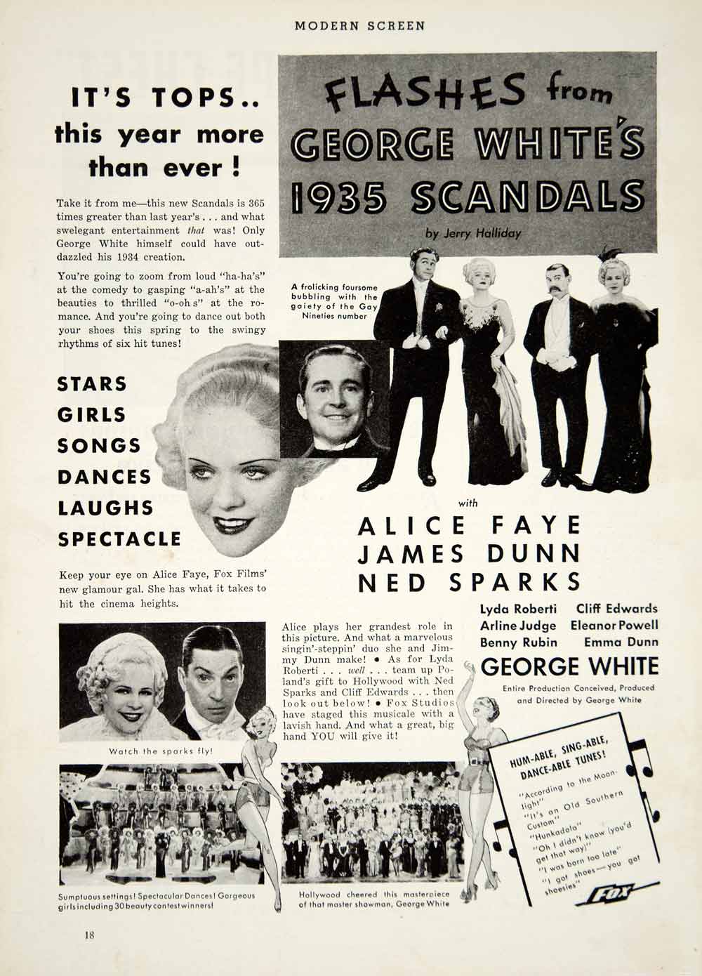 This is an original 1935 black and white print ad for the 1935 Fox movie musical "George White's 1935 Scandals," produced and directed by George White and starring Alice Faye, James Dunn, and Ned Sparks.