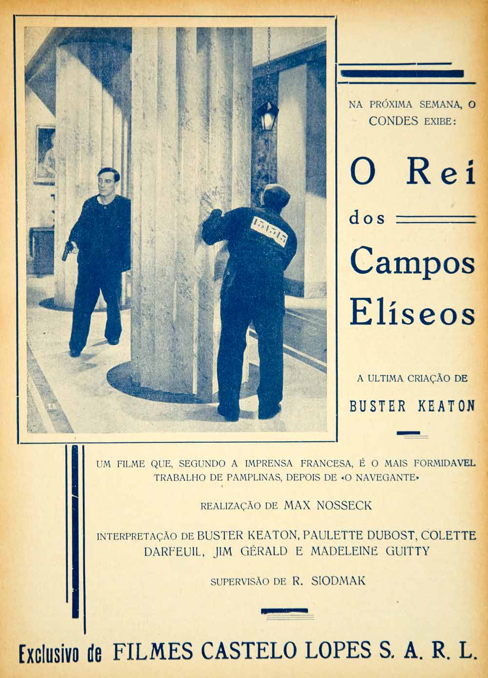 This is an original 1935 monochrome print ad in Portuguese for the 1934 film comedy "O Rei dos Campos El’sios" (AKA "Le Roi des Champs-ƒlysŽes," "The King of the Champs Elysees"), directed by Max Nosseck and starring Buster Keaton, Madeleine Guitty, and Paulette Dubost.