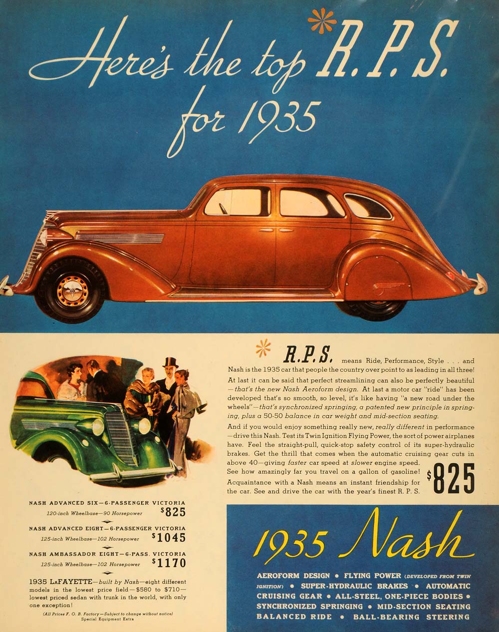 This is an original 1935 color print ad promoting the Nash Advanced Six, Nash Advanced Eight, Nash Ambassador Eight and La Fayette automobiles.
