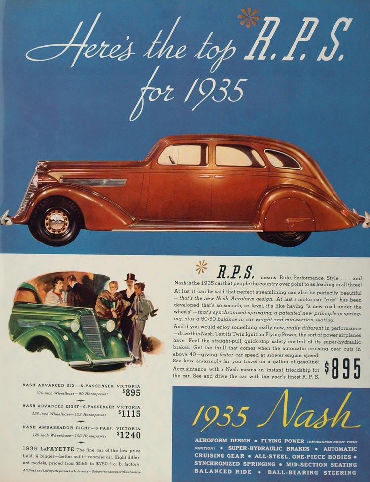 This is an original 1935 color print ad for Nash automobiles including the Nash Advanced Six--6 Passenger Victoria; the Nash Advanced Eight--6 Passenger Victoria; and the Nash Ambassador Eight--6 Passenger Victoria, with prices.
