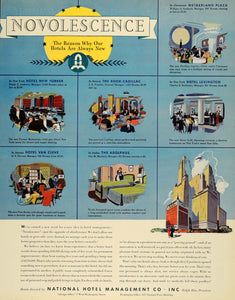 This is an original 1935 color print ad promoting the Netherland Plaza, Hotel New Yorker, The Book-Cadillac, Hotel Lexington, Hotel Van Cleve and The Adolphus hotels from the National Hotel Management Company, Incorporation located at 77 West Washington Street, Chicago, Illinois.