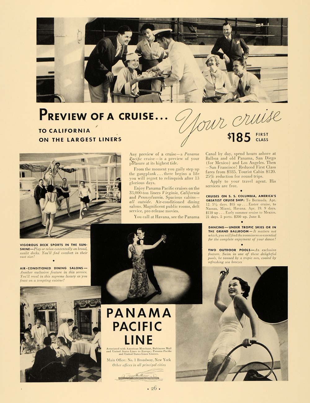 This is an original 1935 black and white print ad promoting the Panama Pacific Line cruise located on 1 Broadway, New York.