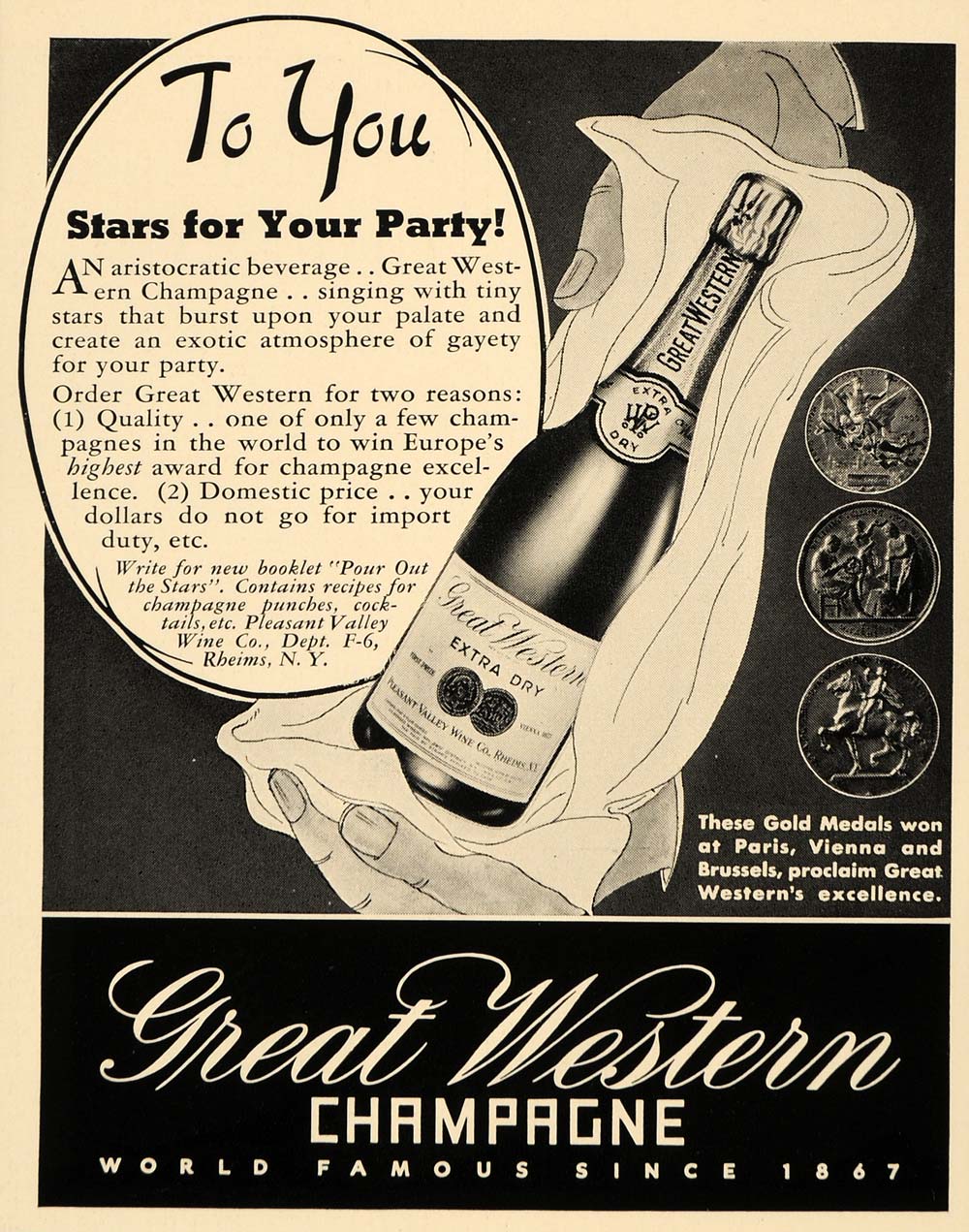 This is an original 1935 black and white print ad promoting the Great Western Champagne from Pleasant Valley Wine Company located in Rheims, New York.