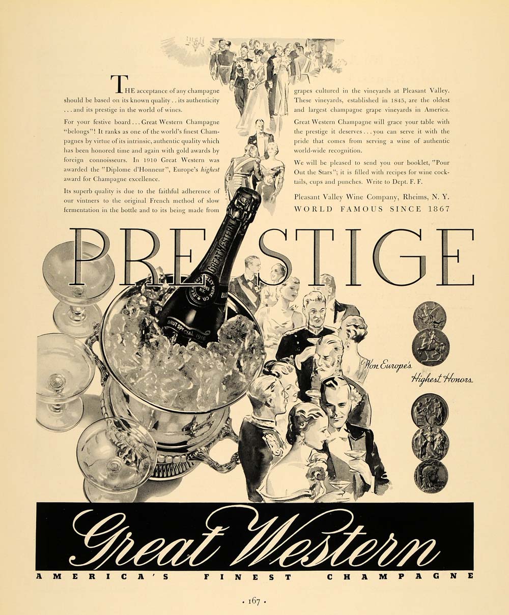 This is an original 1935 black and white print ad for the Pleasant Valley Wine Company of Rheims, New York, featuring their Great Western Champagnes, which won Europe's "Highest Honors".