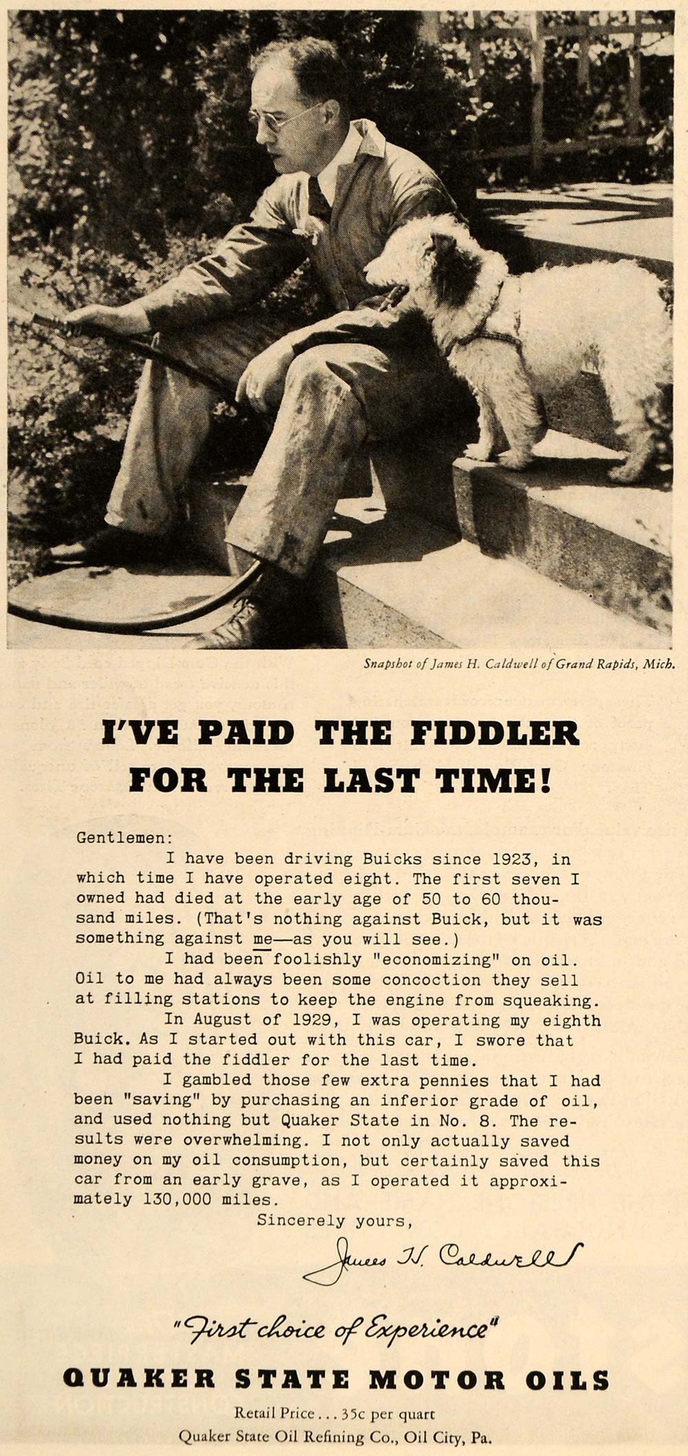 This is an original 1935 black and white print ad for Quaker State Motor Oils, a product of the Quaker State Oil Refining Company of Oil City, Pennsylvania. This ad features an image and a letter from Mr. James H. Caldwell of Grand Rapids, Michigan, who uses Quaker State Oil in his Buick automobiles.