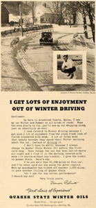 This is an original 1935 black and white print ad for the Quaker State Oil Refining Company of Oil City, Pennsylvania. This ad features their Quaker State Winter vehicular Oils, which help keep cars in tip-top shape in the colder months. The image and letter in this ad are of Mr. Vernon Palmer, a winter driver from Caribou, Maine.