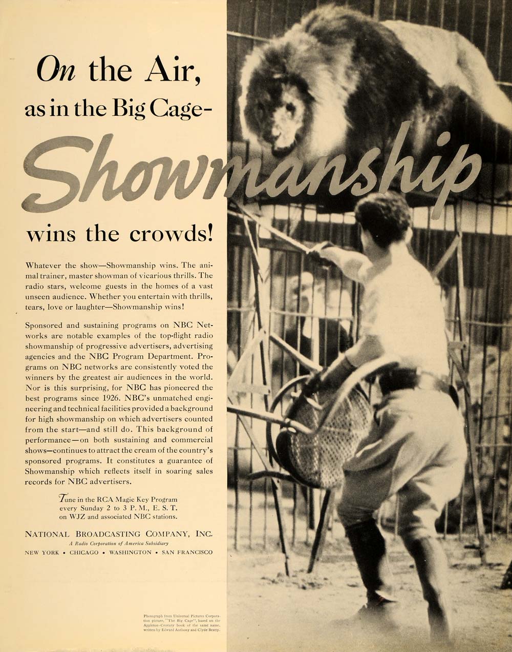 Keywords specific to this image: lion trainer, RCA magic Key Program, WJZ, showmanship Vintage Advertising