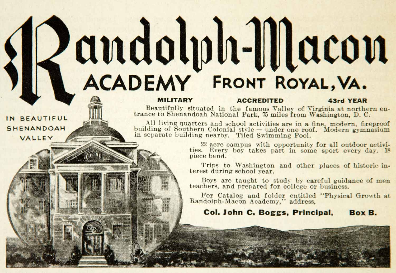 Keywords specific to this image: Vintage Advertising, Virginia, Education, School, Building, Facade, Campus, Colonel John C. Boggs, Southern Colonial Architecture