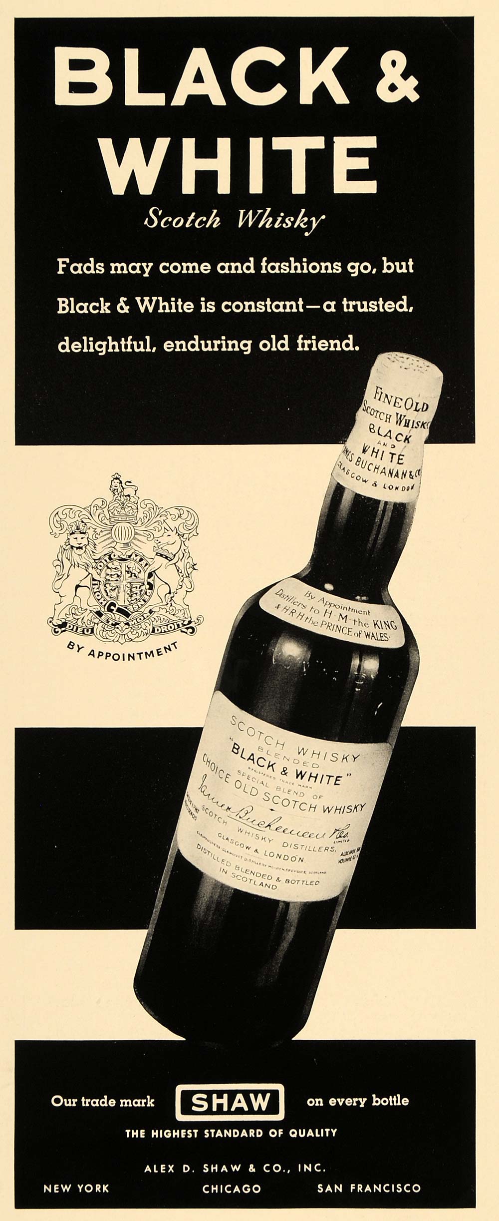 This is an original 1935 black and white print ad for the Black & White Scotch Whisky from Alex D. Shaw & Company, Incorporation located in New York.