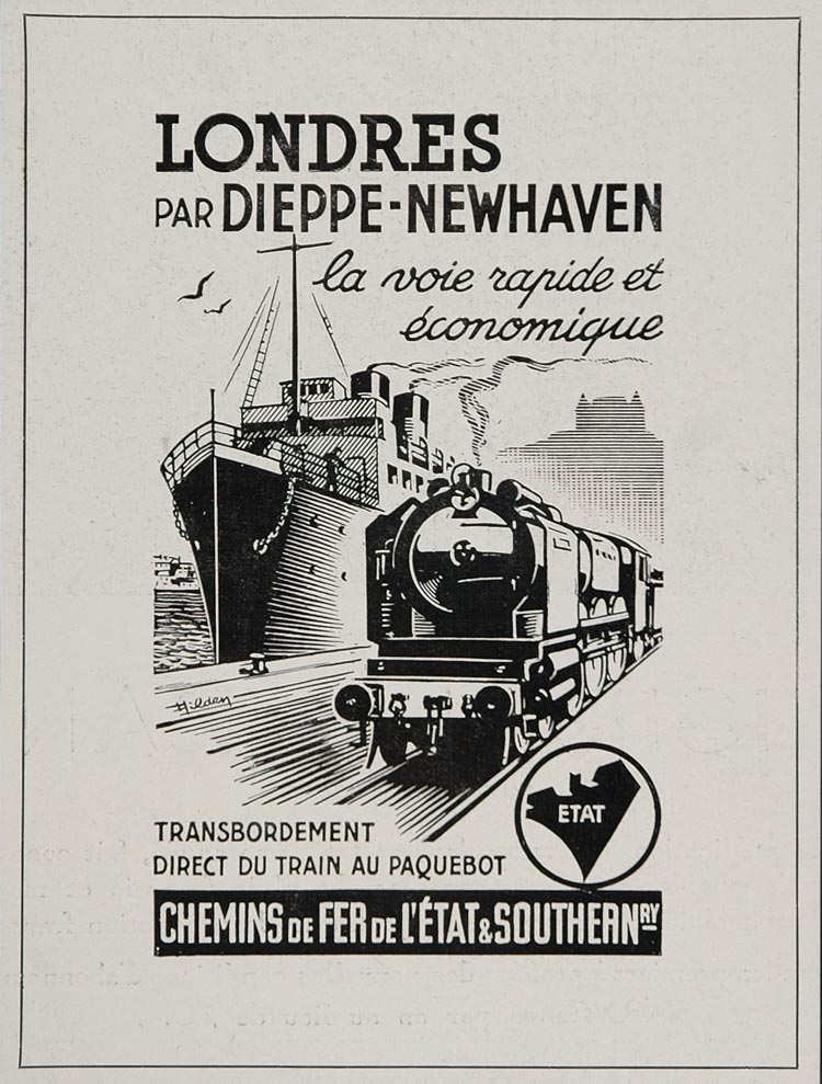 This is an original 1935 black and white print ad for travel to London via Dieppe-Newhaven from Chemins de Fer de l'ƒtat, an early French railway company.