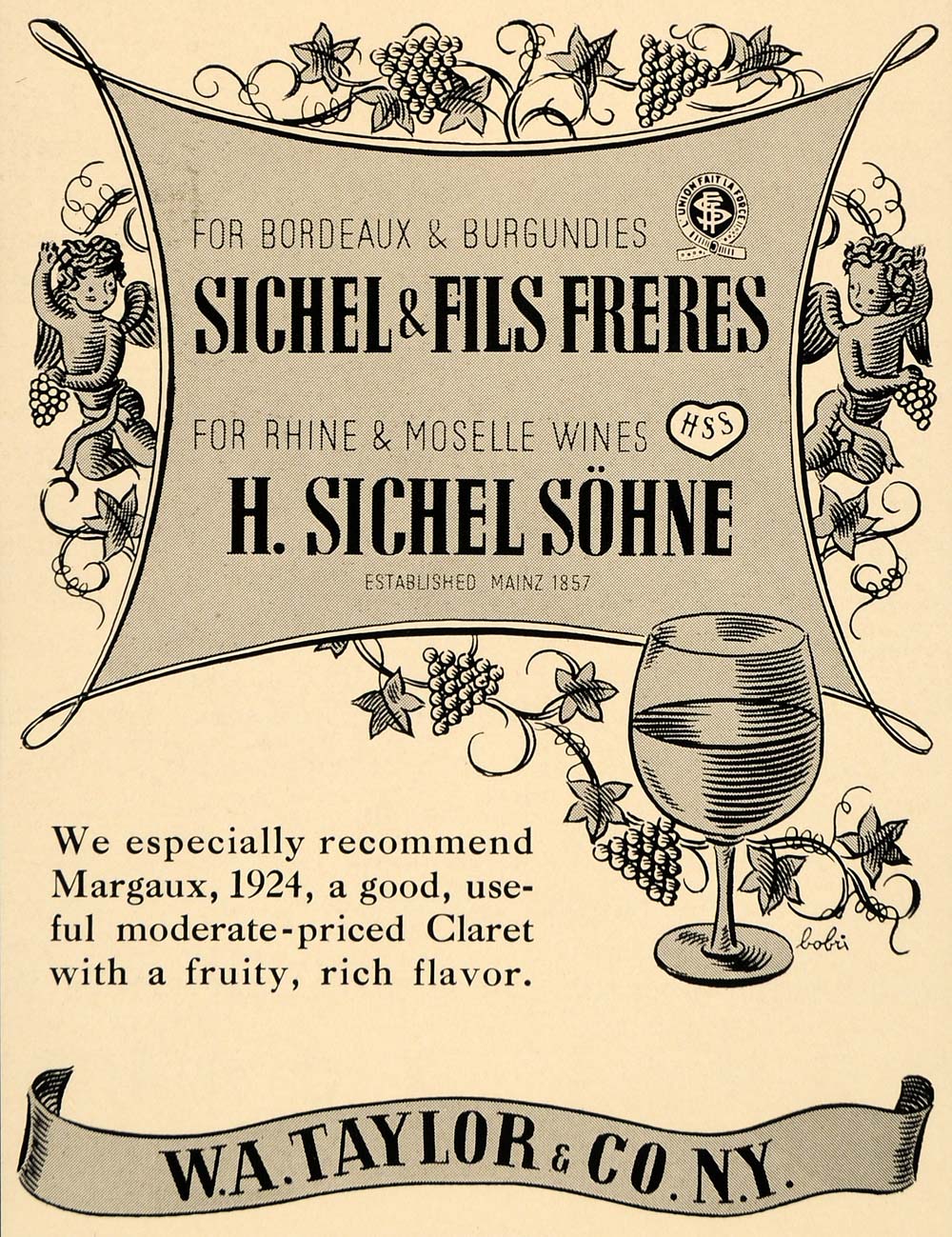 Keywords specific to this image: Bordeaux & Burgundies, Rhine & Moselle wines, liqueur, alcoholic beverages, alcohol, glass Vintage Advertising