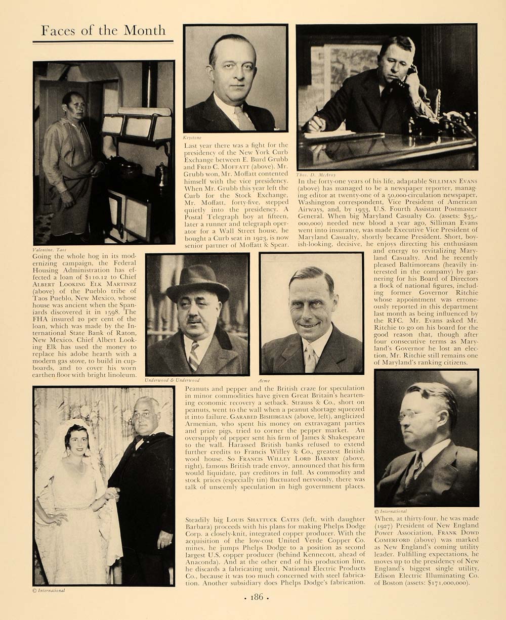 This is an original 1935 black and white halftone print for Faces of the Month from the Fortune Magazine. This magazine would recognize men and women who were important, and acknowledge their success. Some of these men include Silliman Evans, Fred C. Moffatt, Francis Willey Lord Barnby, and Louis Shattuck Cates.