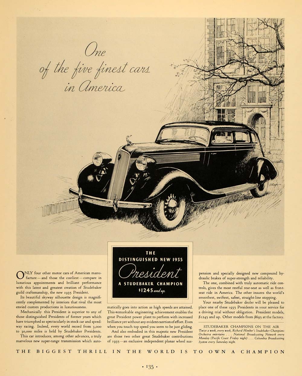 This is an original 1935 black and white print ad for the Studebaker President, a Studebaker Champion vehicle model. This ad has a blurb in the bottom right corner describing Richard Himber's Studebaker Champion Orchestra entertainment on the National Broadcasting Network and the Columbia Broadcasting System.