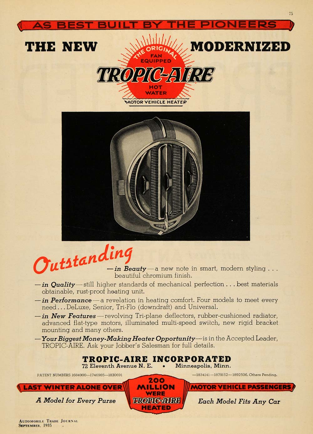 This is an original 1935 color print ad for a new modernized fan equipped Tropic-Aire hot water motor vehicle heater by Tropic-Aire Inc. located at 72 Eleventh Avenue N. E., Minneapolis, Minnesota.