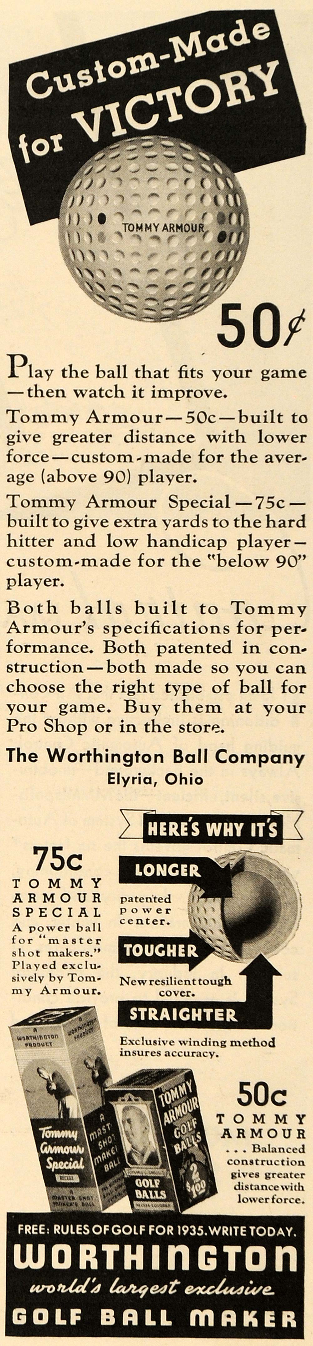 This is a small original 1935 black and white print ad for the Tommy Armour golf ball from Worthington Ball Company located in Elyria, Ohio.