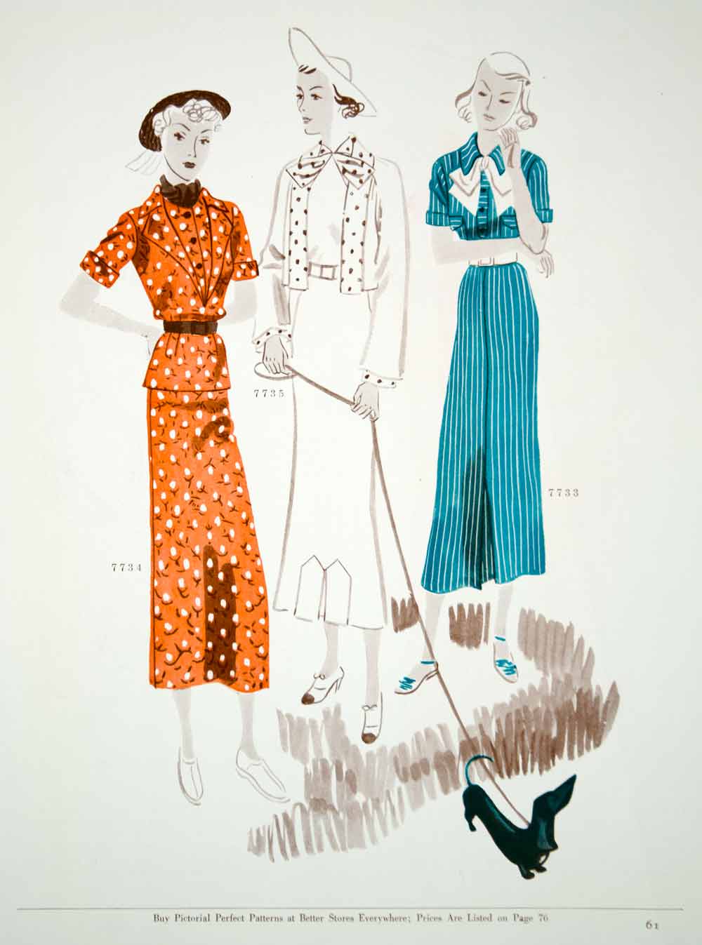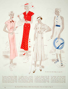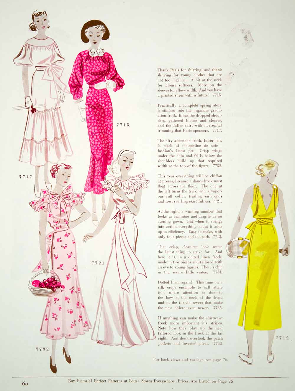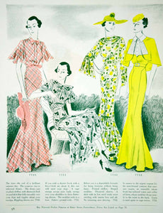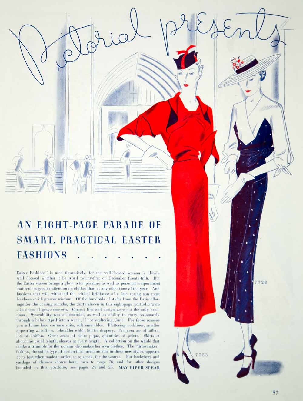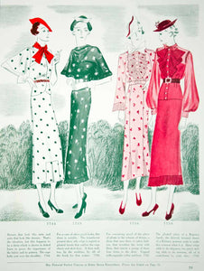 This is an original 1935 six-page (3 pages, double-sided) print article with color illustrations of 1930's Easter fashions for women. Note the long sleek lines and elegant hats that were characteristic of the period. Please see all six images.