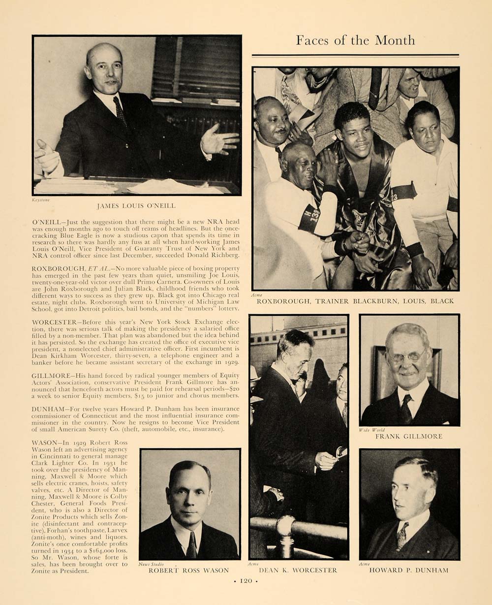 Keywords specific to this image: James Louis O'Neill, NRA, Blue Eagle, Guaranty Trust of New York, John Roxborough, Joe Louis, Primo Carnera, Julian Black, University of Michigan Law School, New York Stock Exchange, Dean Kirkham Worcester, Equity Actors' Association, Frank Gillmore, Howard P. Dunham, American Surety, Robert Ross Wason, Clark Lighter, Manning Maxwell Moore, Colby Chester, General Foods, Zonite, Forhan's Toothpaste, Larvex,